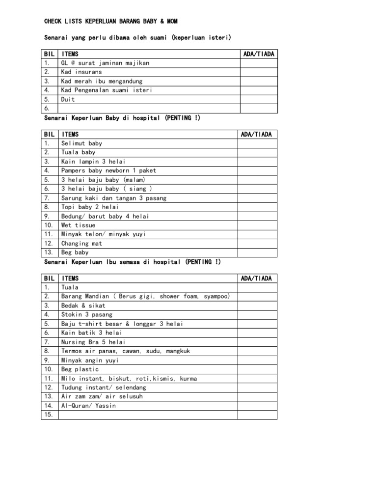 Senarai Checklist Barang Ibu Dan Bayi Sebelum Bersalin Di Hospital Vacamania